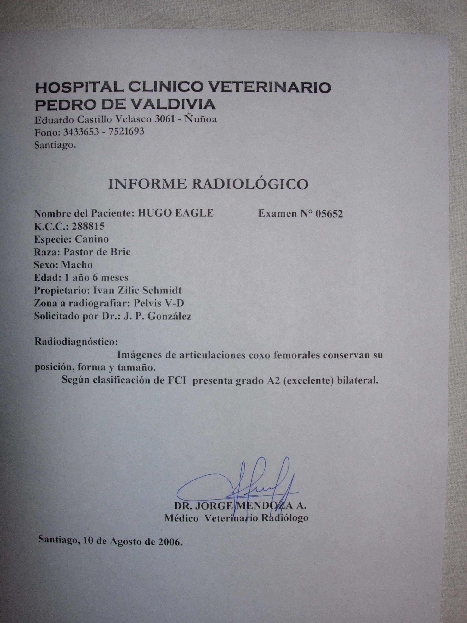 Nuestros reproductores se encuentran certificados como libres de displasia de cadera. Al hacer click en la imagen, se abrirá la imagen en tamaño completo.